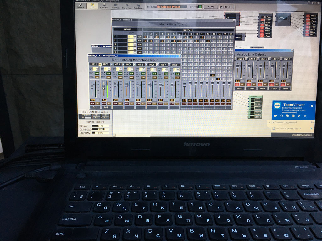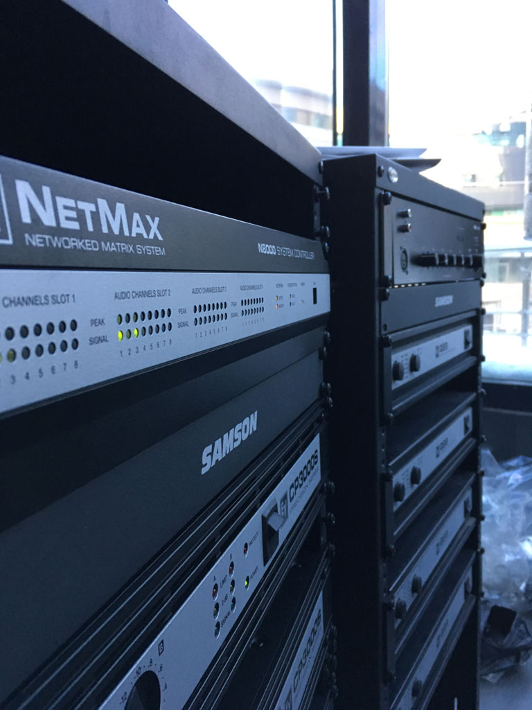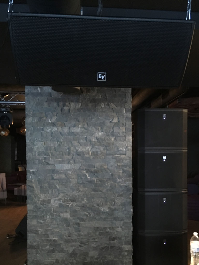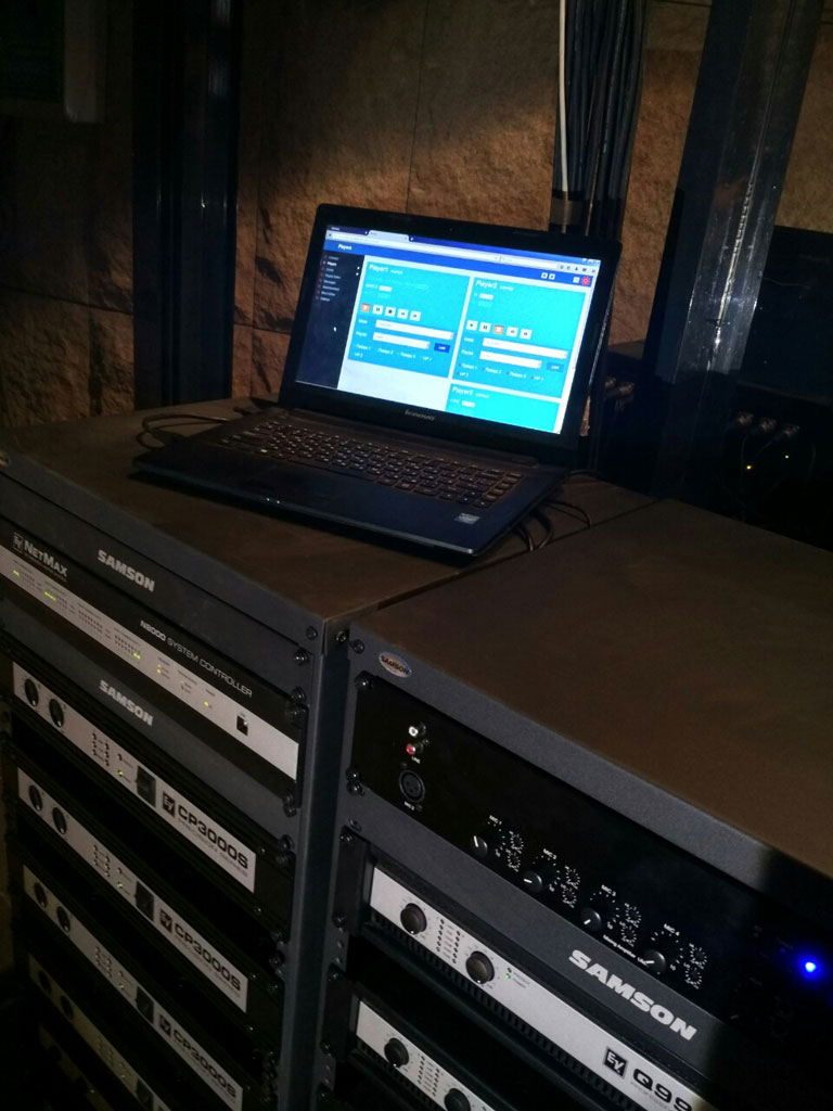 The whole complex is basically divided into following zones – bar on the first floor, restaurant on the second floor, restaurant with two VIP-zones on the third floor, plus lavatories and service rooms. The multizone broadcasting software AMOZzPLAYER was installed on a PC and through the Audinate Dante Virtual Sound card is connected over a standard Ethernet cable to the Dante module Electro-Voice DM-1 installed to the sound processor Electro-Voice N8000. This processor is placed in a system RACK with all the power amplifiers in the equipment room. It gathers all the signals coming from the stage and routes them to the power amplifiers for all the zones in the system. In this way the combination of AMOZzPLAYER + DVS + N8000 + DM-1 makes up to 16 completely independent broadcasting zones with the possibility to apply filters, delays, frequency and dynamics processing to the signal broadcasted to each independent zone.